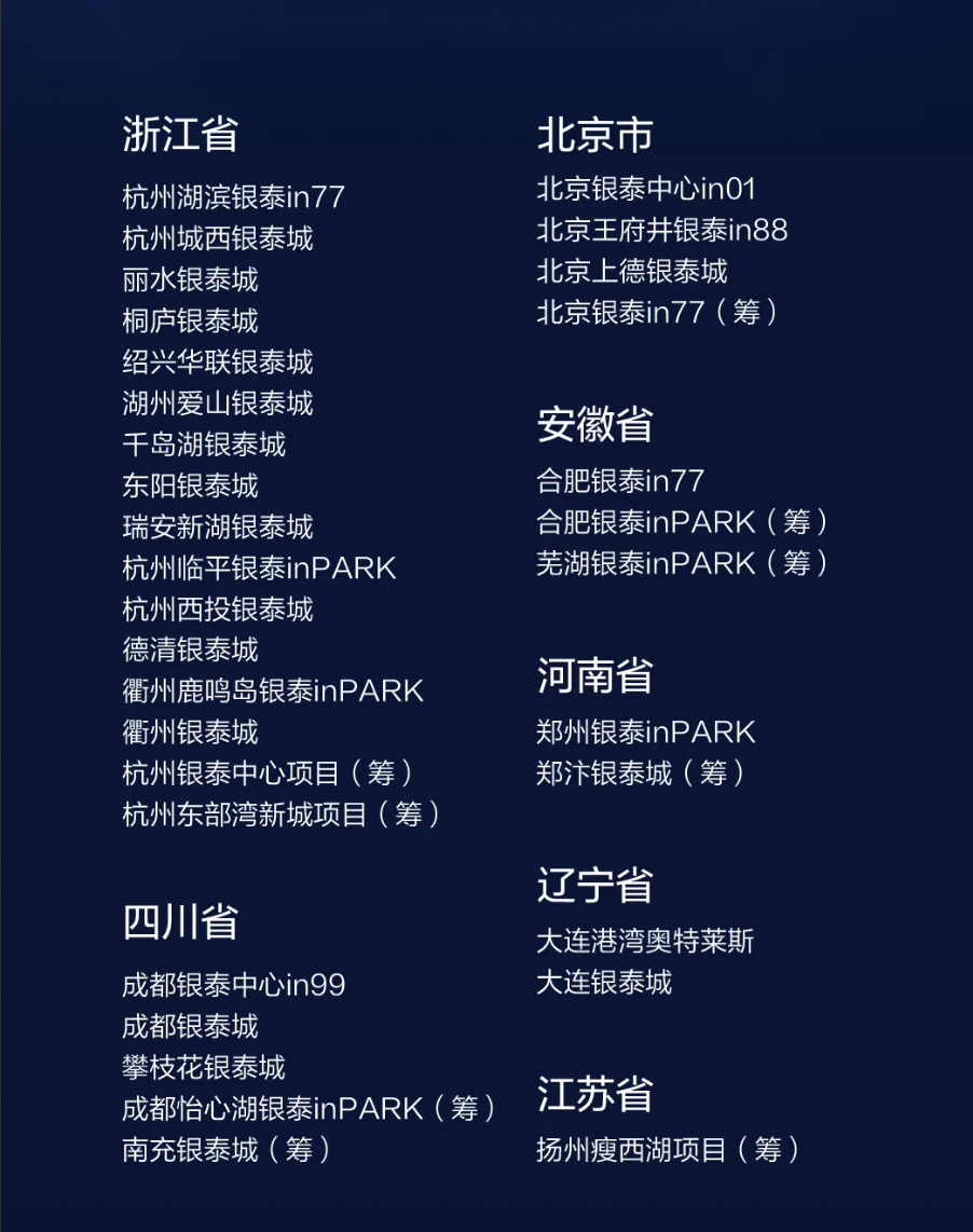 截至目前,in銀泰商業(yè)全國在管項(xiàng)目增加到33個(gè),足跡已經(jīng)遍布北京、杭州、成都、鄭州、大連、合肥、麗水、紹興、湖州、桐廬、蕪湖、揚(yáng)州等城市。