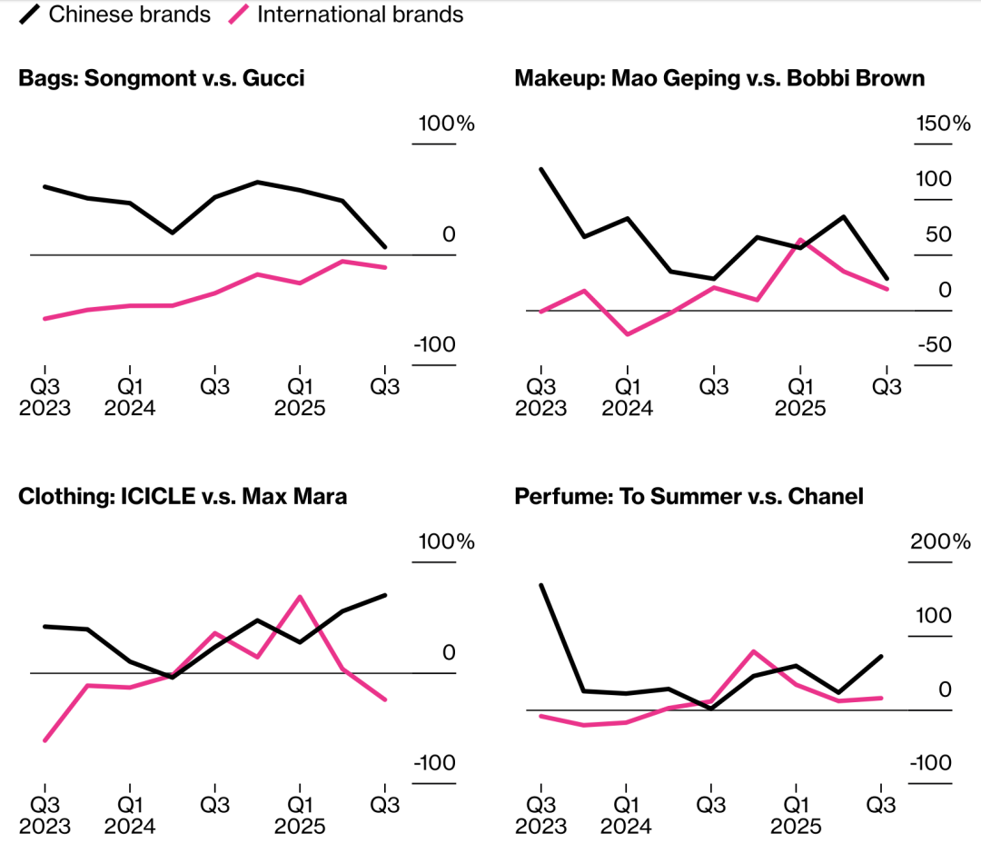 彭博在近期報道中指出,“中國490億美元的奢侈品市場正在快速變化!本唧w體現(xiàn)在:中國消費者對西方高端品牌的支出停滯不前,他們的大手筆消費正轉(zhuǎn)向本土品牌,“這些品牌的崛起正重塑中國奢侈品市場格局,并迫使全球奢侈品巨頭們密切關注!薄^去兩年,五家極具代表性的中國品牌(山下有松、老鋪黃金、毛戈平、觀夏、之禾)的線上銷售增長速度超過了海外的“高階”品牌。