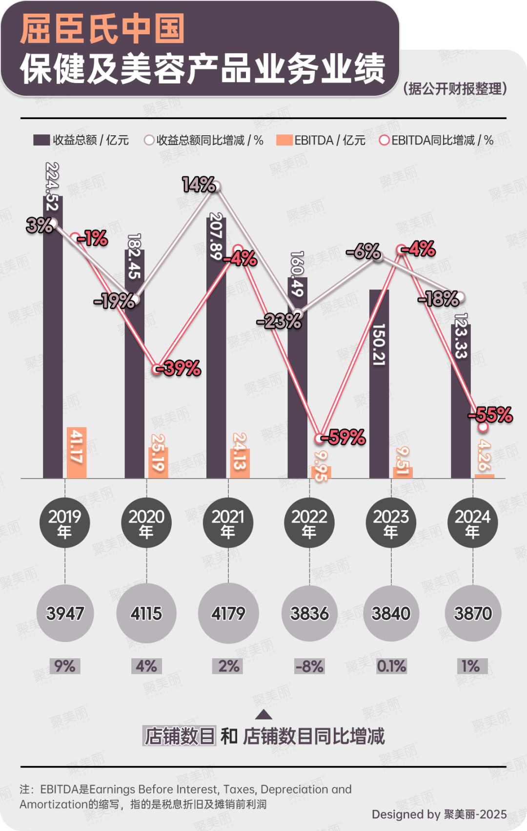 從財(cái)報(bào)來看,屈臣氏集團(tuán)在全球及中國(guó)市場(chǎng)的表現(xiàn)均不盡如人意。從下圖來看,屈臣氏集團(tuán)雖在2024年創(chuàng)下店鋪數(shù)量高峰,但仍難掩頹勢(shì)——收益額、EBITDA(稅息折舊及攤銷前利潤(rùn))雙雙增速放緩,且在2019-2024年期間還出現(xiàn)多次業(yè)績(jī)下滑。