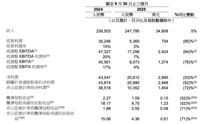 11月25日,阿里巴巴發(fā)布2026財(cái)年Q2(截至2025年9月底)財(cái)報(bào),營收2477.95億元,同比增長5%,剔除已出售業(yè)務(wù)影響,同比增長15%;凈利潤206.12億元,同比下降53%。