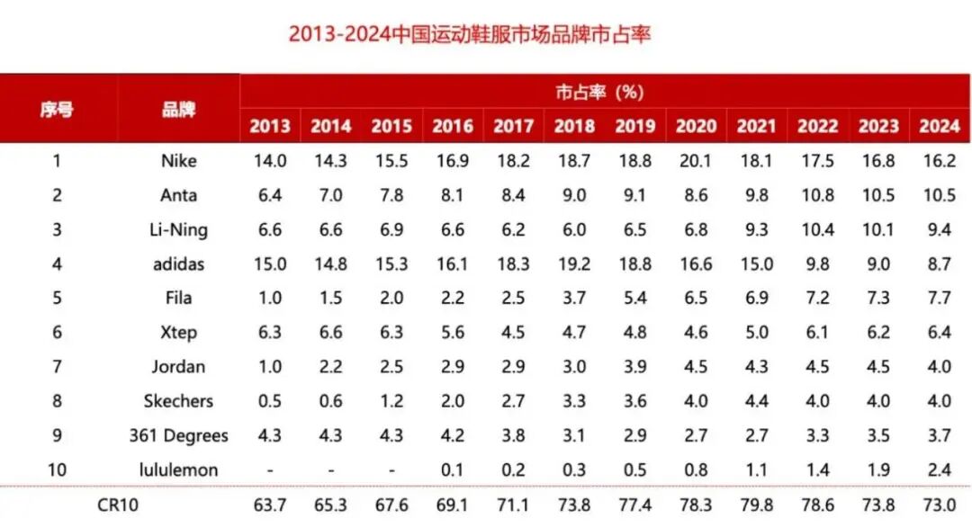 根據(jù)歐睿數(shù)據(jù),2024年耐克在中國的市占率為16.2%。雖然仍然保持了第一位置,但比2021年下降了將近2%。