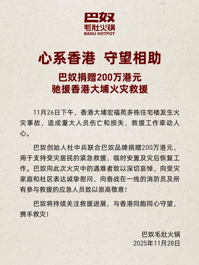 11月28日,巴奴發(fā)布公告稱,巴奴創(chuàng)始人杜中兵聯(lián)合巴奴品牌捐贈200萬港元(約合人民幣181.86萬元),用于支持受災居民的緊急救援、臨時安置及災后恢復工作。