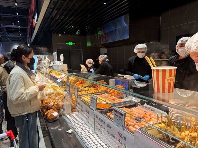 水果區(qū)作為生鮮重點,主推明蝦、阿克蘇蘋果、干堯榴蓮、云南藍莓等國內(nèi)外品質(zhì)果品。其中,當季熱銷的砂糖橘源自云南高原海拔500米以上核心產(chǎn)區(qū),得益于超2000小時的充足日照,果徑嚴格篩選在40毫米以上,確保了果實飽滿、口感甜而不膩。熟食板塊匯聚多款現(xiàn)場制售的人氣產(chǎn)品,九多肉多招牌香辣豬蹄以其香辣過癮、軟糯Q彈、膠質(zhì)豐富的特點成為解饞佳品;熱鹵甜腸堅持現(xiàn)煮出鍋,香氣撲鼻,一口爆汁更過癮,牢牢抓住了年輕食客的味蕾。烘焙區(qū)則主打榴蓮千層蛋糕、雙拼瑞士卷、榴蓮大福等暢銷單品,憑借真材實料、動物奶油與高性價比,迅速成為家庭采購與年輕消費群體的追捧焦點。