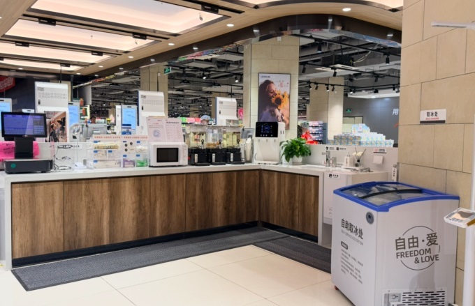 為了方便顧客,門店增加便民服務(wù)區(qū),洗手臺、紙巾、烘手器、護(hù)手霜、直飲水、一次性紙杯、公平秤、微波爐、茶飲、糖果等便民設(shè)施一應(yīng)俱全。此外,針對特殊需求顧客推出寵物寄存柜等服務(wù)。
