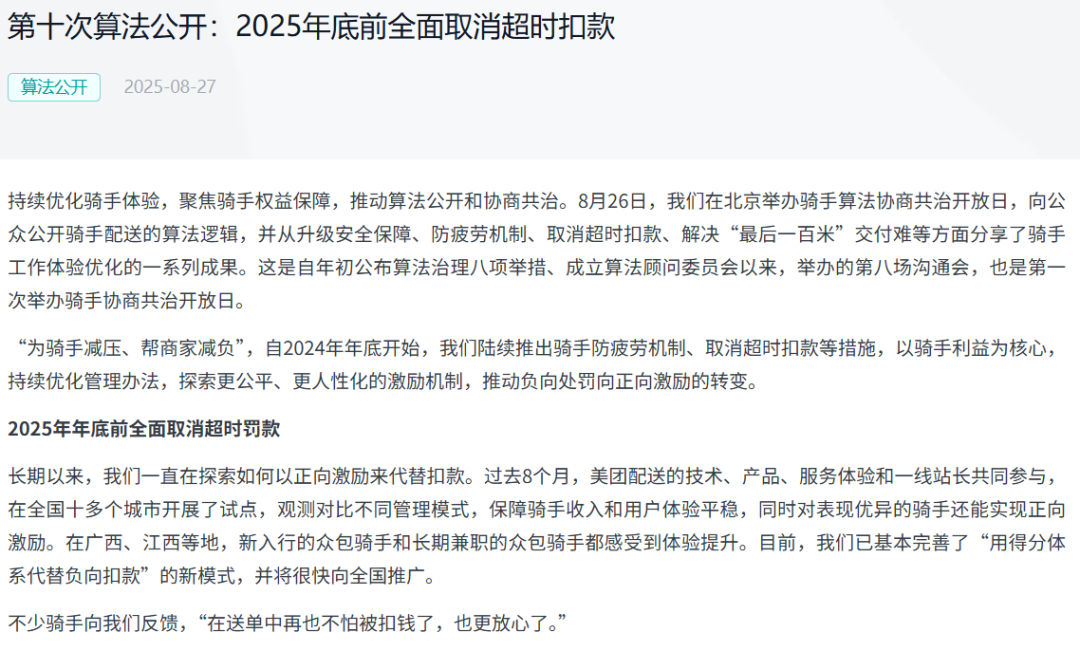 截至今年8月,該機(jī)制已在22個(gè)城市落地試行。美團(tuán)方面表示,將在今年年底前全面取消超時(shí)罰款。