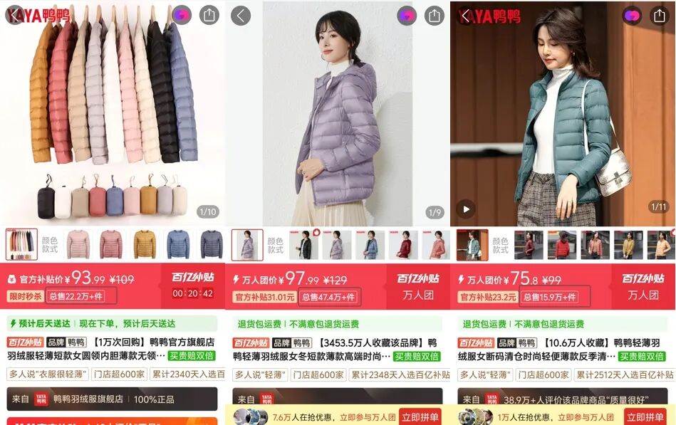 與此同時,入門級市場也保持堅挺,鴨鴨部分售價低至百元以下的輕薄款羽絨服在拼多多賣出近50萬件,駱駝、雅鹿等品牌的低價位產(chǎn)品也十分暢銷。
