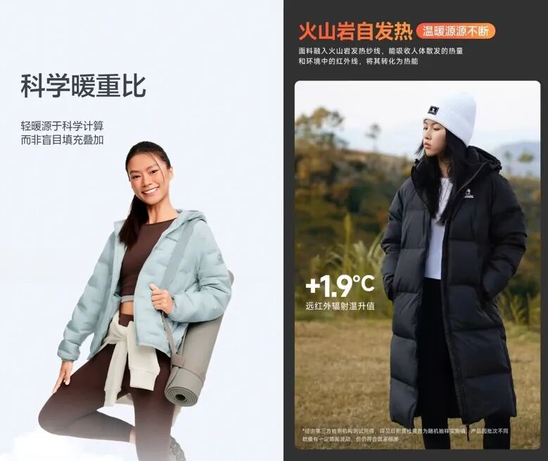 比如波司登今冬主打產(chǎn)品之一“云感鵝絨”系列,就強調(diào)“科學暖重比”概念:充絨量與衣服重量為0.2:1,達到輕、暖平衡效果。此外,各種太空科技、極地鎖溫技術也開始讓位于更貼合實際需求的“微創(chuàng)新技術”,如駱駝“火神”系列羽絨服借助火山巖發(fā)熱紗線,收集環(huán)境中的紅外線轉(zhuǎn)化為熱能,達到較好的熱能鎖溫效果。