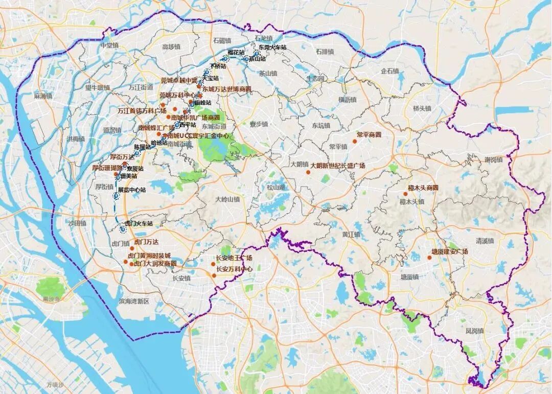 下圖是東莞2022年整體商業(yè)分布圖,購物中心、步行街、城市廣場分布廣泛。