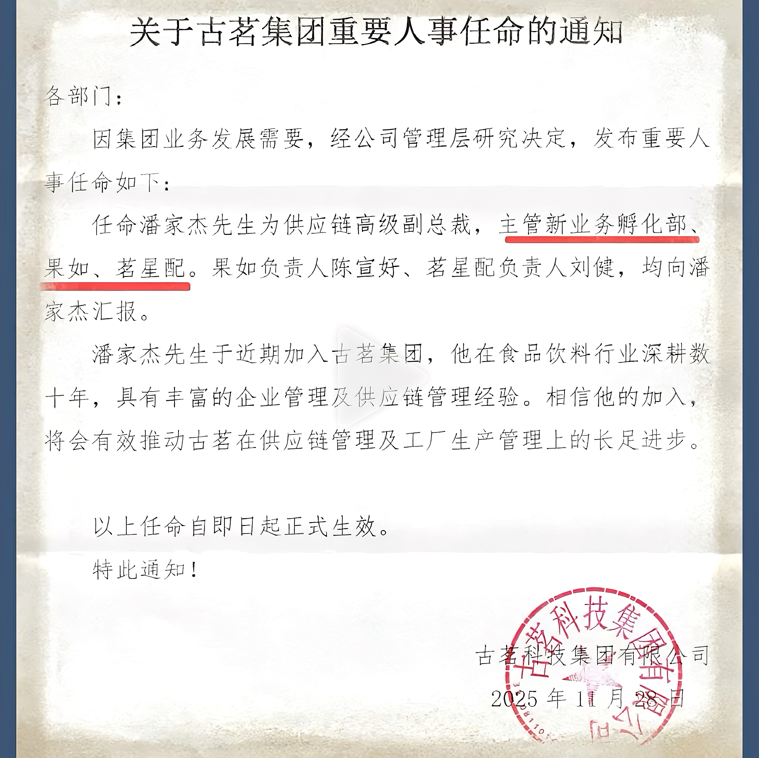 近日,茶咖觀察獲悉,11月28日,原娃哈哈集團(tuán)董事、常務(wù)副總經(jīng)理潘家杰加入古茗,擔(dān)任供應(yīng)鏈高級(jí)副總裁,主管新業(yè)務(wù)孵化部、果如、茗星配,果如負(fù)責(zé)人陳宣好、茗星配負(fù)責(zé)人劉健,均向潘家杰匯報(bào)。