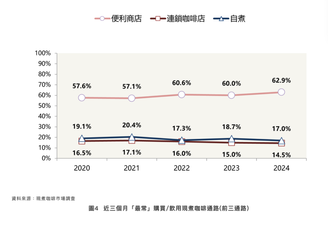 數(shù)據(jù)顯示,2024年,97.2%的消費者過去三個月曾在便利店(如統(tǒng)一超商的CITY CAFE、全家的Let's Café等)購買現(xiàn)煮咖啡;消費者最常購買/飲用的渠道也是以便利商店為首,占比達到62.9%。