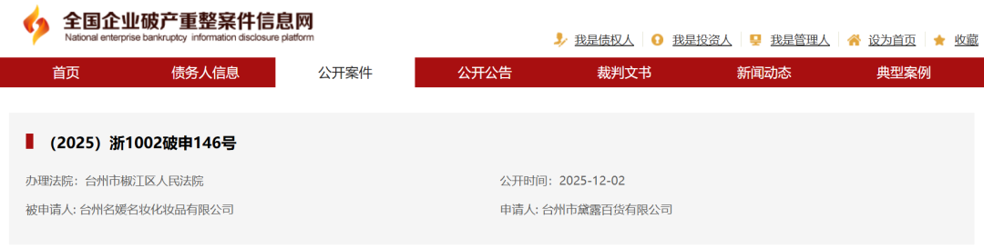 臨近2025年末,破產(chǎn)潮似乎仍在化妝品行業(yè)持續(xù)蔓延,目標(biāo)成為“中國絲芙蘭”的臺州名媛名妝化妝品有限公司(下稱:名媛名妝),就在強制執(zhí)行數(shù)千萬后,新增了破產(chǎn)審查案件。