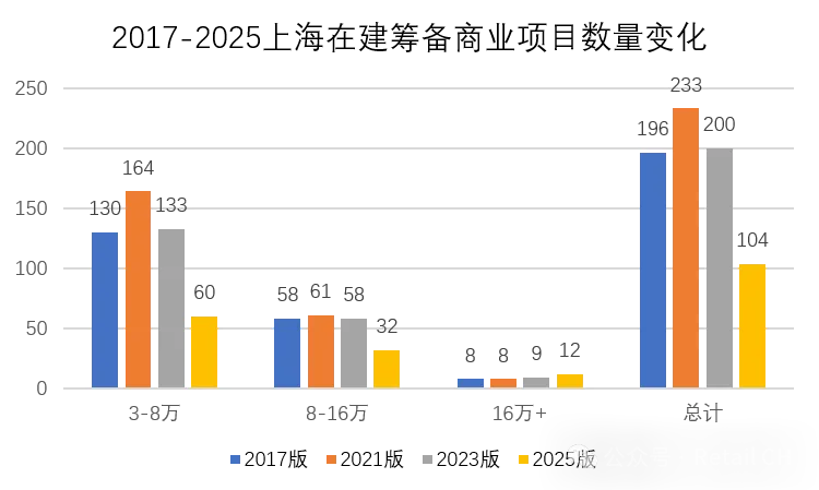 3萬-8萬㎡的商業(yè)項(xiàng)目作為市場基本盤,數(shù)量從2017年的356個穩(wěn)步增長至2025年的461個,增幅顯著。