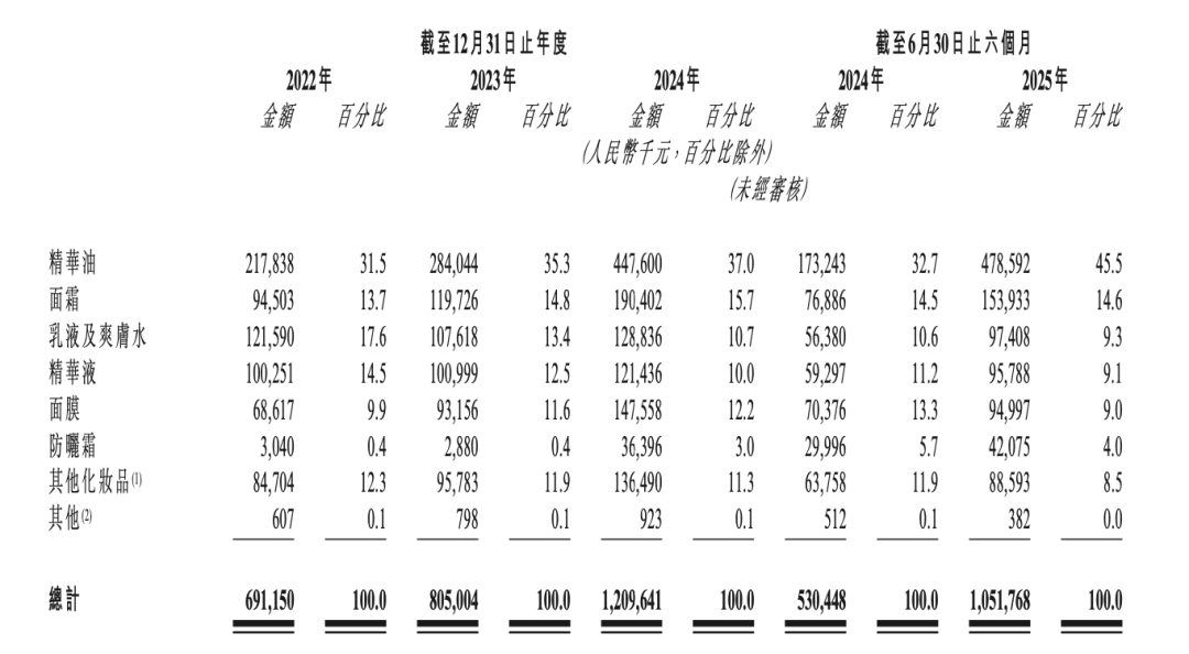 雖然精華油是超級大單品,但林清軒對其依賴度相對較低。數(shù)據(jù)顯示,2024年,其面霜、乳液及爽膚水、面膜營收分別為1.9億元、1.29億元、1.48億元,貢獻總營收的15.7%、10.7%、12.2%;2025年上半年,面霜收入增至1.54億元,已初步形成較為完整的產(chǎn)品矩陣。