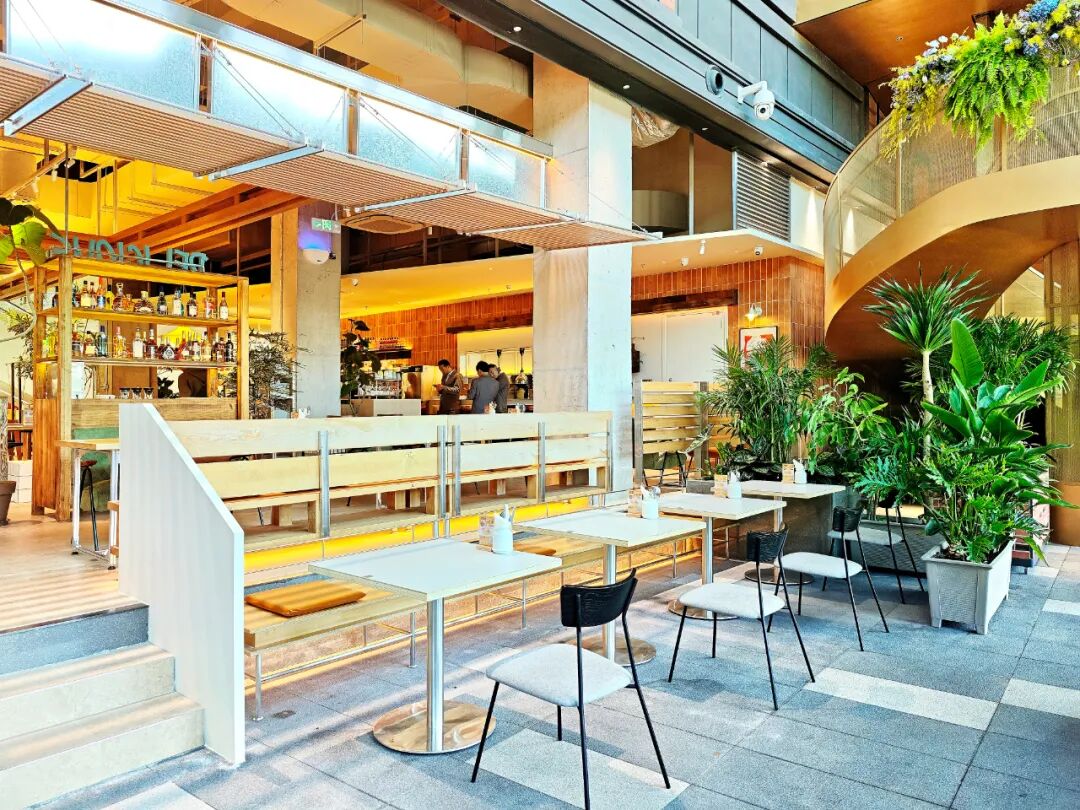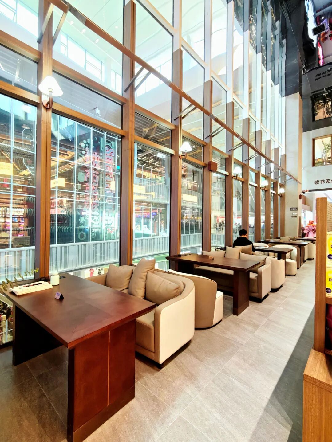 項目在一樓臨戶外美食街一側,利用挑空結構的室內(nèi)廣場,以無隔斷、開放式、高顏值餐廳為視覺中心,結合外擺區(qū)與各類小吃店,構成視野開闊、通透舒展、包羅萬象的新式餐飲區(qū),將精致感與煙火氣融合得恰到好處。