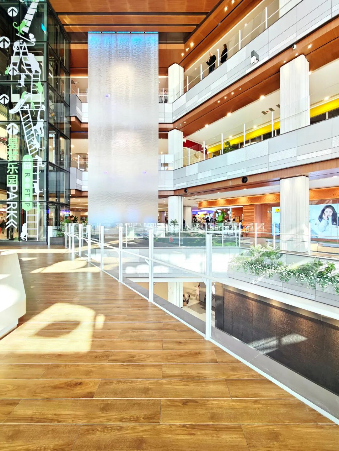 室內(nèi)以「南廣場、北廣場、晨夕廣場」為三大空間節(jié)點,南廣場的水幕瀑布、通天大屏、錯層連廊的組合,突出生生不息的主題元素「水」;永旺超市所在的北廣場則采用原木色的內(nèi)裝風格,更凸出有生命力的主題元素「木」。