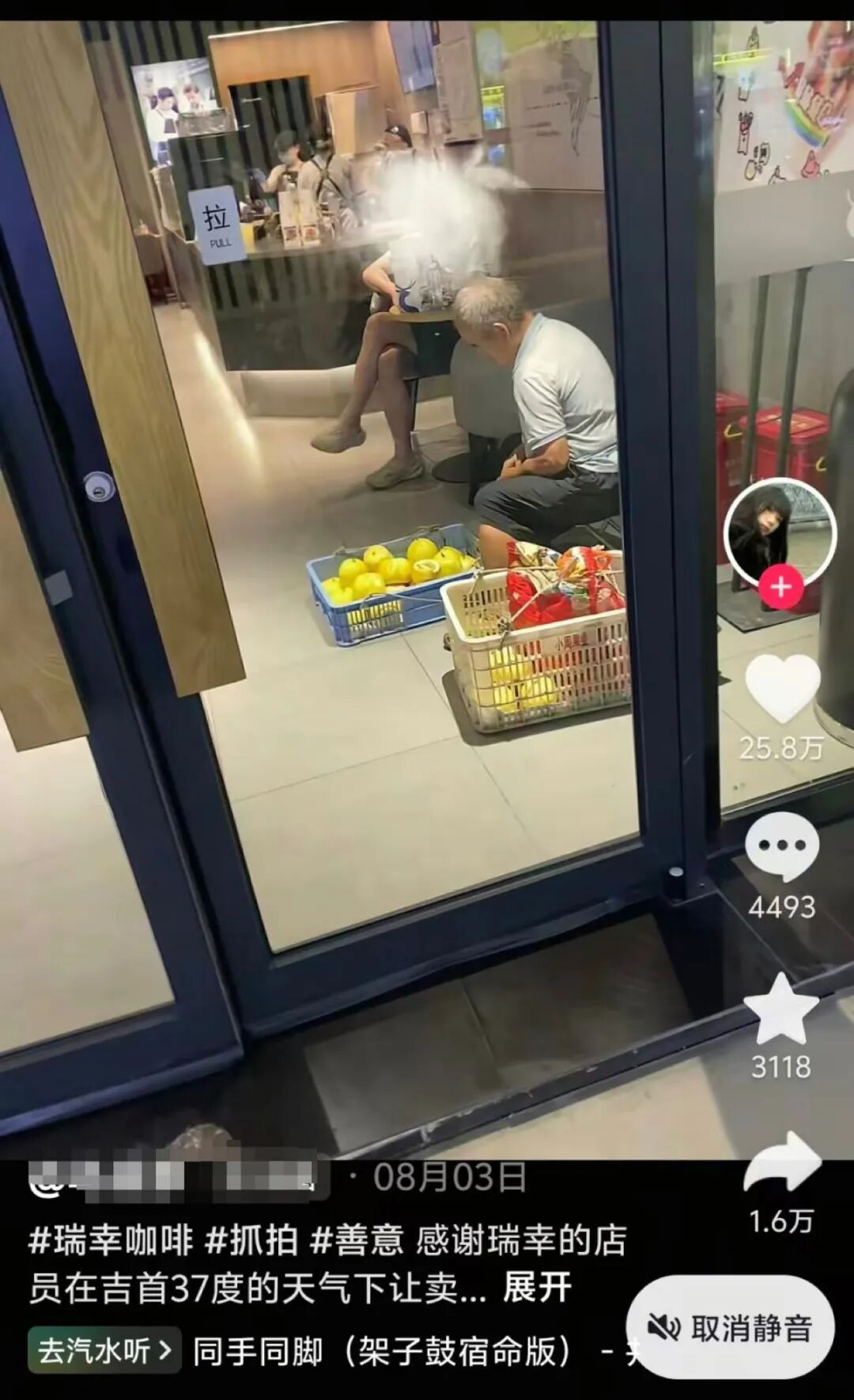 八月的氣溫近40℃,一位白發(fā)老人挑著水果,局促地站在商場(chǎng)冷氣入口,不時(shí)用草帽扇風(fēng)。瑞幸店員石林見狀遞上冰水,并安撫老人,告知老人可在此售賣。又考慮經(jīng)營(yíng)秩序,他便將老人安置在客流少的服務(wù)臺(tái)旁遮陰區(qū)售賣水果。這一暖心舉動(dòng)被路人拍發(fā)抖音,引發(fā)大量點(diǎn)贊轉(zhuǎn)發(fā),網(wǎng)友稱贊“被暖到了”,不少人專程到商場(chǎng)支持,為門店帶來可觀客流。
