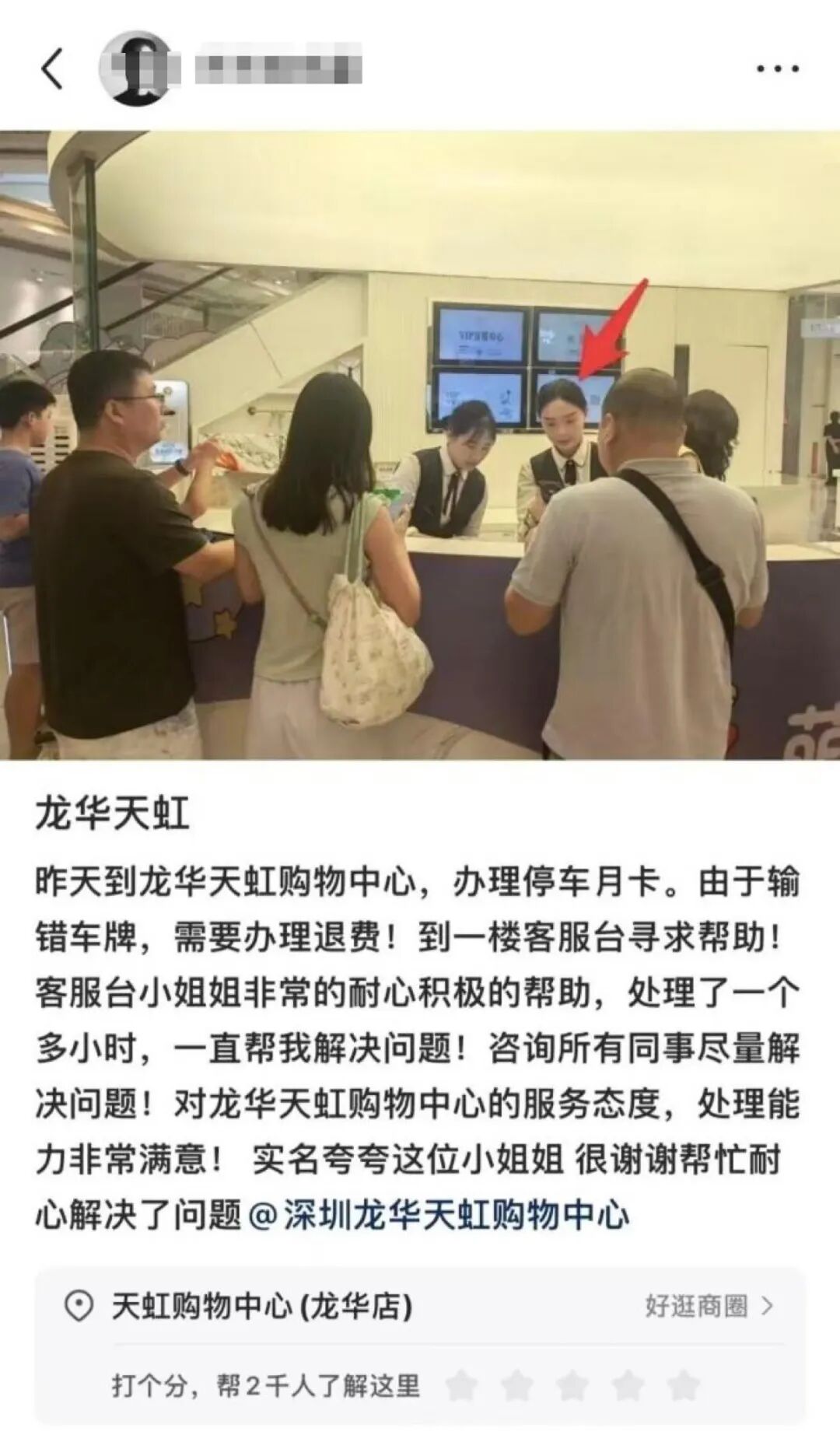 某天兩位顧客來到商場(chǎng)客服中心尋求幫助,他們?cè)邶埲A天虹購(gòu)物中心辦理停車月卡時(shí),因顧客自己操作失誤輸錯(cuò)車牌信息導(dǎo)致無法繳費(fèi)出車。顧客情緒焦急,此時(shí)客服臺(tái)排隊(duì),專員郭馥婷耐心接待,先安撫情緒,再主動(dòng)咨詢同事、反復(fù)核對(duì)信息、多次申請(qǐng)協(xié)調(diào),持續(xù)跟進(jìn)一小時(shí)。最終成功為顧客解決了錯(cuò)誤車牌退費(fèi)問題。顧客當(dāng)場(chǎng)實(shí)名表?yè)P(yáng)其專業(yè)負(fù)責(zé),事后在小紅書分享經(jīng)歷,推薦龍華天虹服務(wù)。