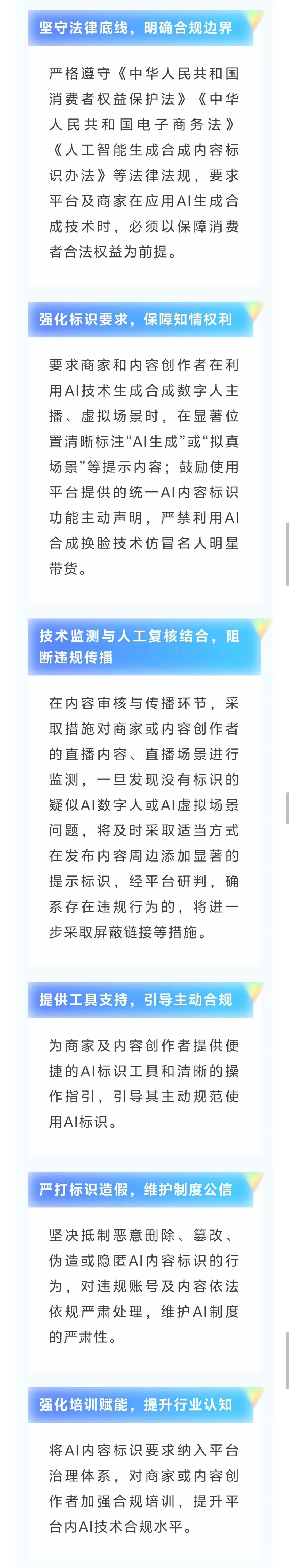 《承諾書》還明確,將嚴(yán)打惡意刪除、篡改、偽造或隱匿AI內(nèi)容標(biāo)識(shí)的造假行為,對(duì)違規(guī)賬號(hào)及內(nèi)容依法依規(guī)嚴(yán)肅處置,全力維護(hù)AI帶貨的規(guī)范秩序。
