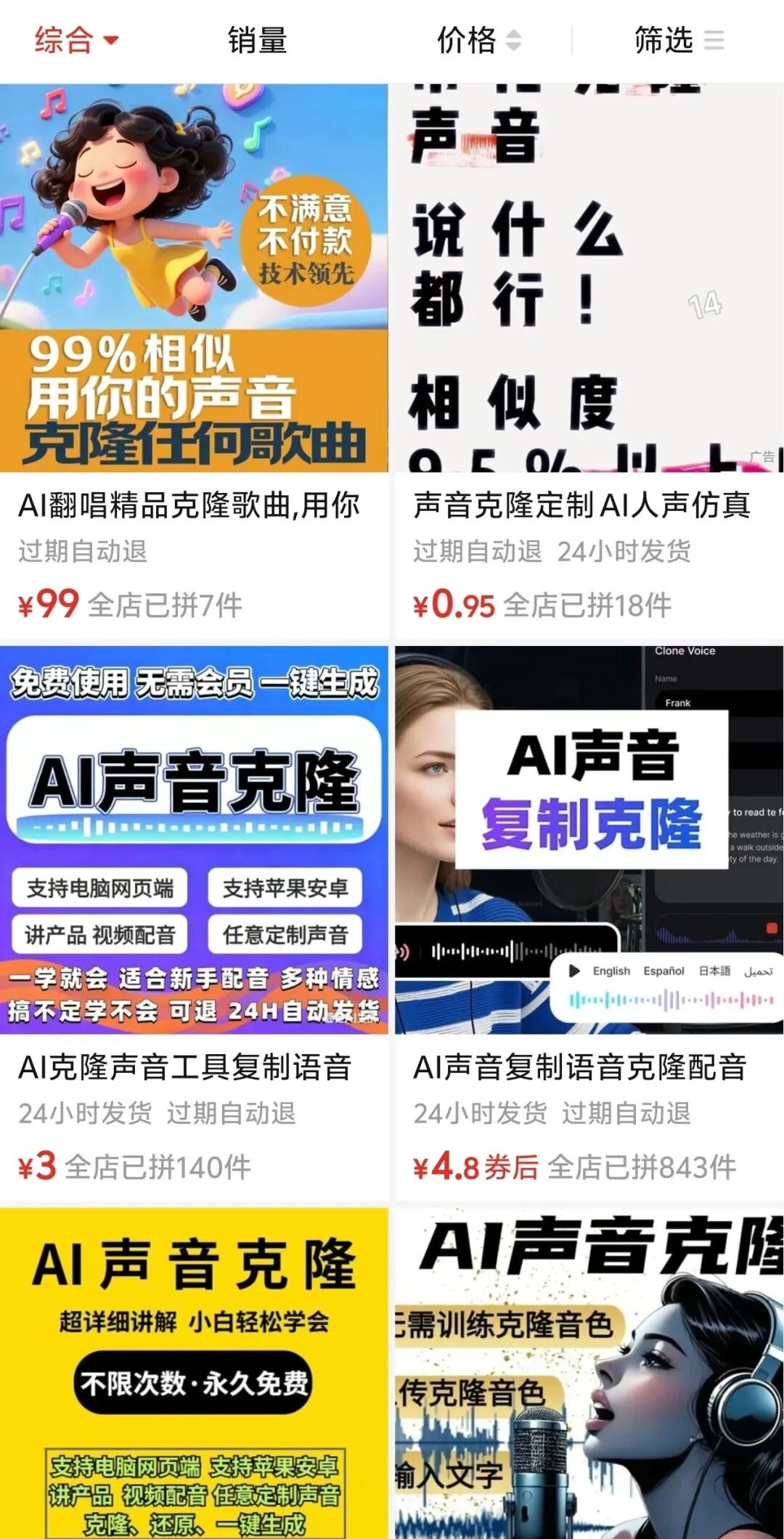 在電商平臺(tái)上,AI聲音克隆工具的售賣明目張膽,幾塊錢到數(shù)百元的教程比比皆是。