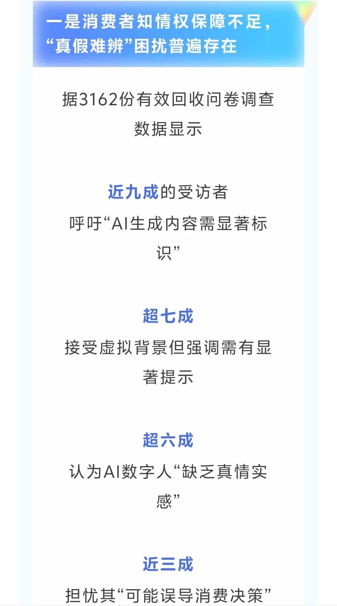 北京消協(xié)專項(xiàng)調(diào)查顯示,近九成受訪者呼吁對(duì)AI生成內(nèi)容進(jìn)行顯著標(biāo)識(shí),超六成消費(fèi)者吐槽AI數(shù)字人“缺乏真情實(shí)感”,近三成受訪者擔(dān)憂其“誤導(dǎo)消費(fèi)決策”。