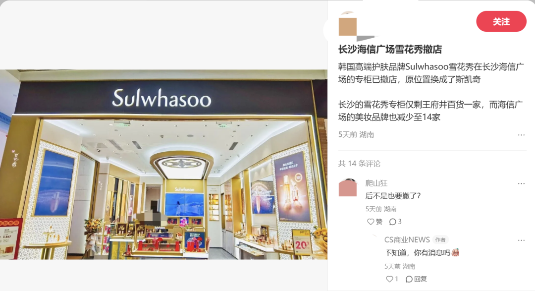 繼上月AP嬡彬關(guān)閉唯一在華線上店后(詳見),聚美麗近日從小紅書平臺(tái)獲悉,愛茉莉太平洋旗下又一高端護(hù)膚品牌雪花秀,也被爆出在長(zhǎng)沙大部分專柜撤店。
