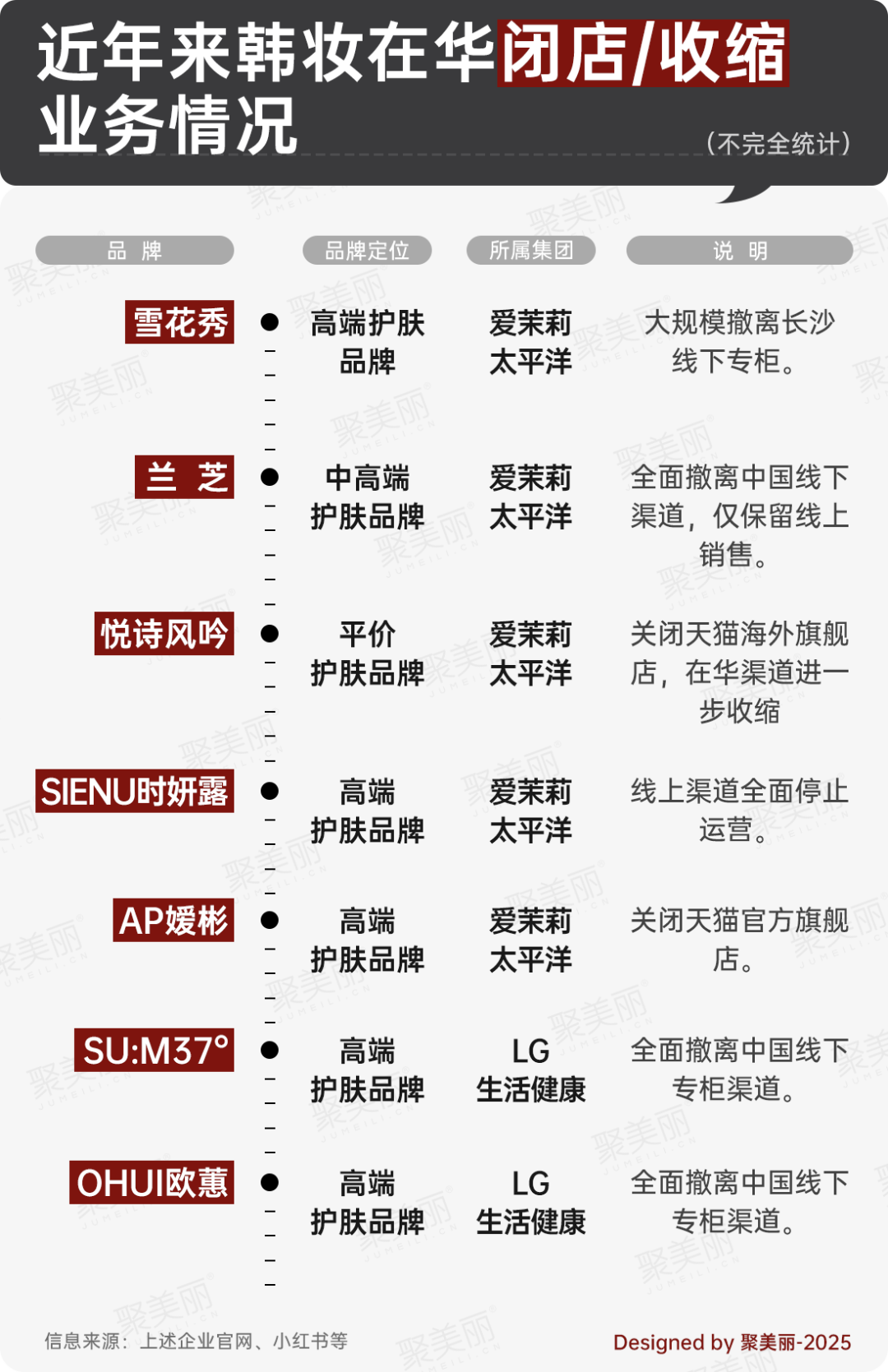 據(jù)聚美麗不完全統(tǒng)計(jì),僅在過去三年內(nèi),至少7個(gè)主打高端護(hù)膚的韓妝品牌在中國(guó)市場(chǎng)收縮戰(zhàn)線或徹底離場(chǎng)。