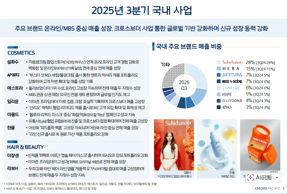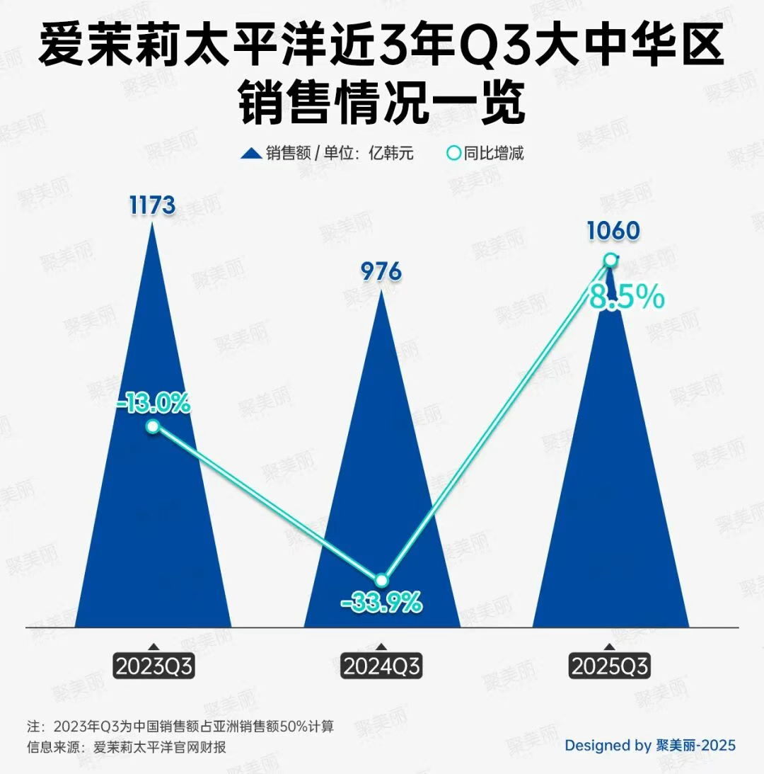 這一系列“撤退”動(dòng)作的背后,是韓妝巨頭在華業(yè)績(jī)的持續(xù)承壓與戰(zhàn)略調(diào)整。以愛茉莉太平洋為例,其近三年第三季度在華銷售額增速猶如過山車,從2023年13.0%的負(fù)增長(zhǎng),到2024年大幅下滑至33.9%。盡管2025年第三季度憑借高端線拉動(dòng)錄得8.5%的增長(zhǎng),但整體復(fù)蘇根基并不穩(wěn)固。
