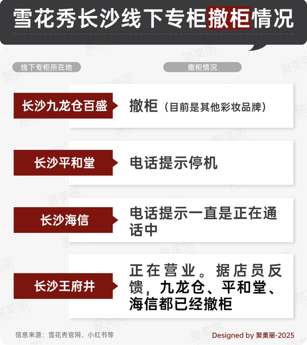 隨后,聚美麗依據(jù)品牌官網(wǎng)披露的信息,對(duì)雪花秀在長(zhǎng)沙的所有專柜展開了電話核實(shí)。經(jīng)調(diào)查發(fā)現(xiàn),該品牌在長(zhǎng)沙的線下布局確已大幅收縮,目前僅剩王府井一家專柜確認(rèn)正常營(yíng)業(yè)。