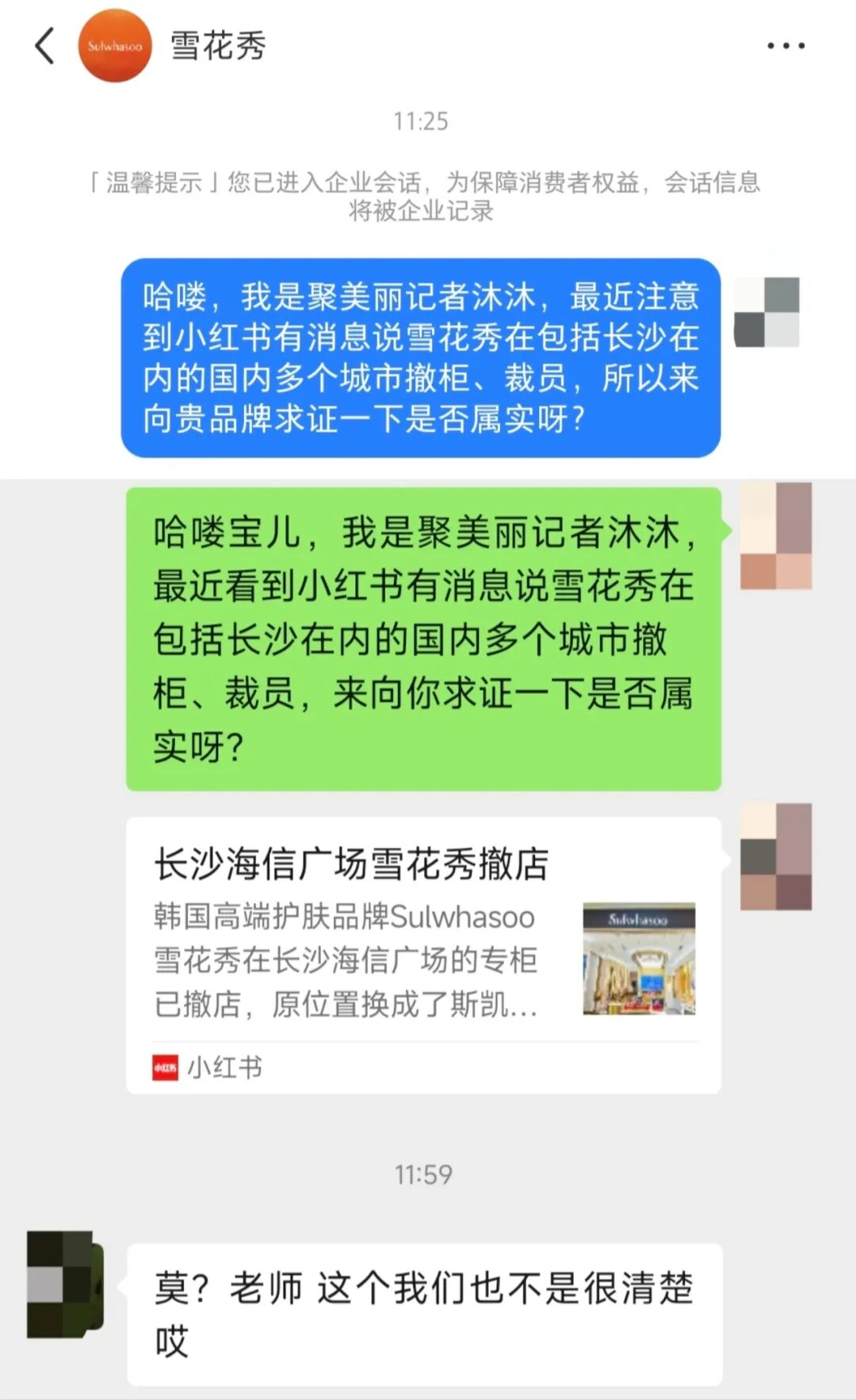 經(jīng)聚美麗記者多次確認(rèn),目前長(zhǎng)沙地區(qū)仍在營(yíng)業(yè)的雪花秀線下專柜,僅有王府井百貨一家。該店店員在電話中也向記者證實(shí):“目前長(zhǎng)沙確實(shí)只有我們這一家線下專柜還在正常營(yíng)業(yè),海信廣場(chǎng)是上個(gè)月剛撤的,其他幾家其實(shí)幾年前就陸續(xù)撤了!