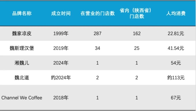 從目前已有的餐飲類別來(lái)看,魏家以多品類布局構(gòu)建消費(fèi)矩陣,既涵蓋涼皮、漢堡等快餐品類,也延伸至湘菜、日料等特色餐飲,其中核心品牌魏家涼皮與魏斯理漢堡已突破西安本地市場(chǎng),開(kāi)啟跨省擴(kuò)張,而其他新興餐飲品牌仍處于區(qū)域試點(diǎn)階段,形成“核心品牌領(lǐng)跑、新興品牌試錯(cuò)”的發(fā)展節(jié)奏。