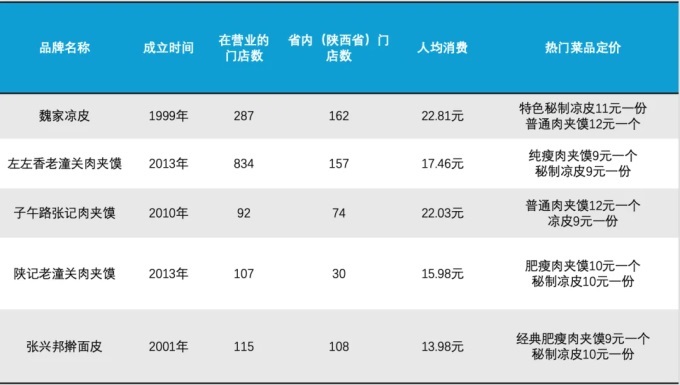 涼皮、肉夾饃類品牌對(duì)比 數(shù)據(jù)來(lái)源:窄門(mén)餐眼