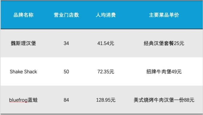 從菜品本身來(lái)看,魏斯理漢堡并非對(duì)標(biāo)更便宜的華萊士、塔斯汀,在外資品牌中也并非完全“對(duì)打”肯德基、麥當(dāng)勞等,而是bluefrog藍(lán)蛙和Shake Shack這類傾向于中產(chǎn)消費(fèi)的西餐品牌。