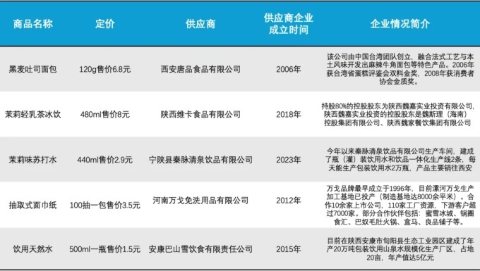 例如,自營(yíng)黑麥吐司的供應(yīng)商為西安唐品食品有限公司。這家源自中國(guó)臺(tái)灣的企業(yè),曾在2008年獲得消費(fèi)者協(xié)會(huì)金質(zhì)獎(jiǎng),產(chǎn)品品質(zhì)有成熟保障;飲用天然水則由安康巴山雪飲食有限責(zé)任公司供應(yīng),該企業(yè)在陜西省安康市旬陽(yáng)縣擁有年產(chǎn)20萬(wàn)噸包裝飲用山泉水的規(guī)模化廠區(qū),既能保障供應(yīng)穩(wěn)定性,又能減少跨區(qū)域運(yùn)輸成本。