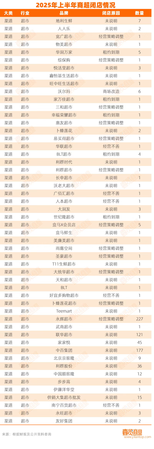據(jù)壹覽商業(yè)不完全統(tǒng)計,2025年上半年,全國至少有720家超市關門,其中卜蜂蓮花、華潤萬家、永輝超市、大潤發(fā)等為代表的大模式倒閉之數(shù)占據(jù)過半。曾經(jīng)作為中國內(nèi)地大賣場的領頭羊家樂福,中國大陸現(xiàn)僅剩3家門店。