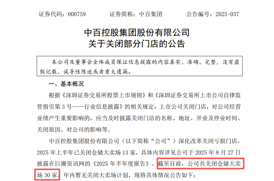 12月4日,中百集團發(fā)布公告稱,為深化經(jīng)營改革,已累計關閉倉儲大賣場30家,其中2025年上半年關閉13家。在這30家門店中,高達23家因虧損而停業(yè),占比76.7%,僅7家是因合同到期正常關閉,因此次閉店產(chǎn)生的一次性損失預計達1.8億元。