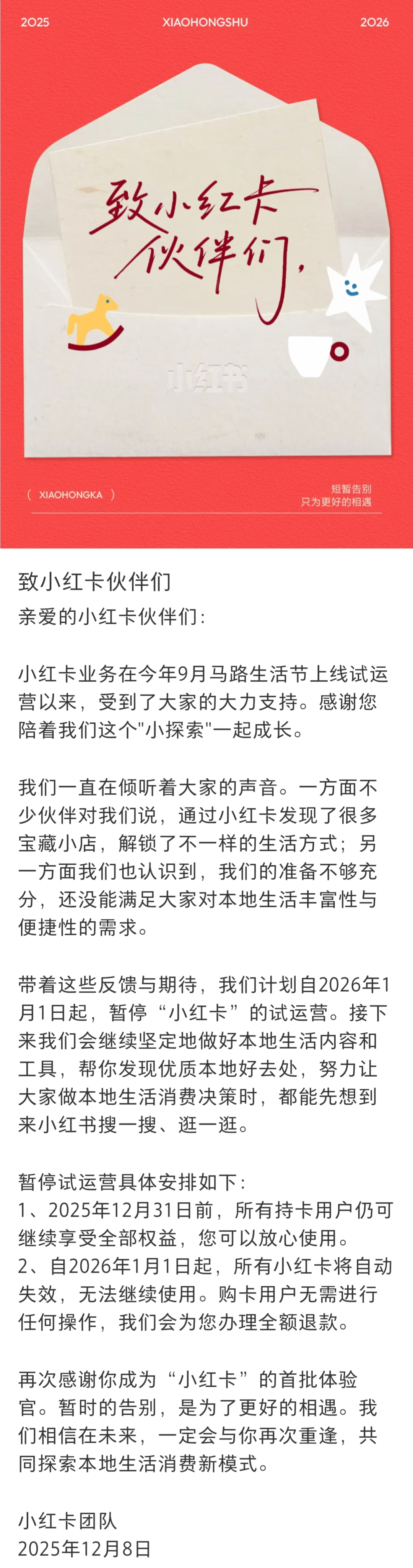 日前,小紅書官方發(fā)布公告稱,由于準備不夠充分,還不能滿足大眾對本地生活豐富性和便捷性的需求,因而“小紅卡”業(yè)務將于2026年1月1日起暫停試運營。