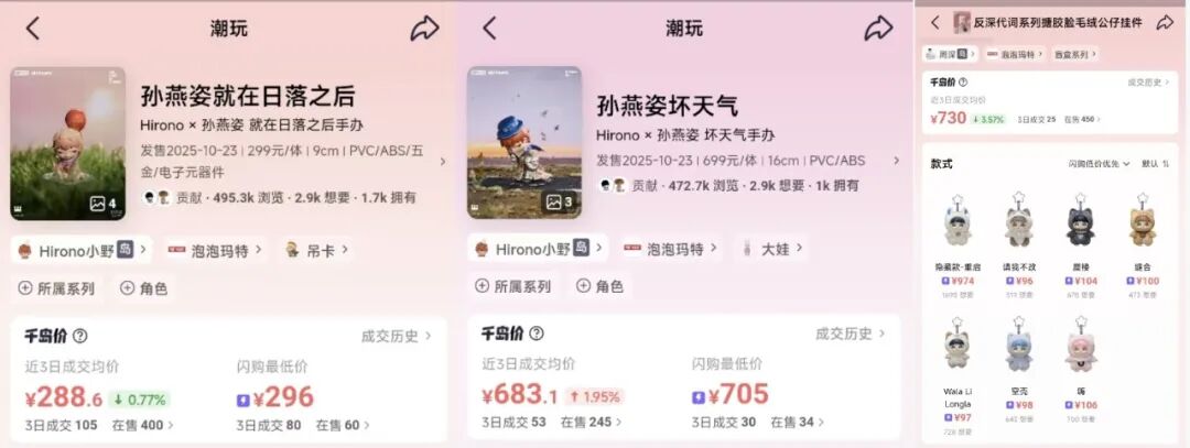 另外,泡泡瑪特與歌手周深聯(lián)名的“反深代詞”系列搪膠毛絨再次上演了“一盒難求”的火爆局面,同樣IP小野Hirono 與歌手孫燕姿聯(lián)名的“日落以后”、“壞天氣”系列手辦,同樣在二手市場被炒到高價。