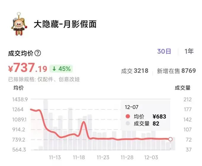 大熱新品WHY SO SERIOUS系列搪膠毛絨的大隱藏——Labubu“月影假面”在二手平臺曾被炒至最高1200多元,不到一個月時間,價格已回落至683元。