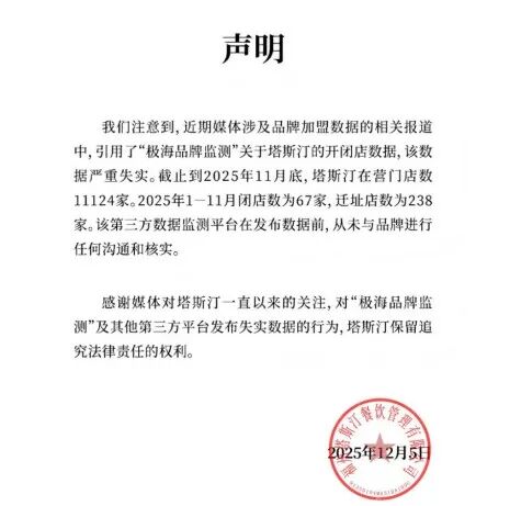 2025年12月5日,塔斯汀官微發(fā)文稱,近期媒體涉及品牌加盟數(shù)據(jù)的報道,引用了“極海品牌監(jiān)測”的開閉店數(shù)據(jù),該數(shù)據(jù)嚴(yán)重失實。截至2025年11月底,塔斯汀在營門店數(shù)11124家。今年1-11月閉店數(shù)為67家,遷址店數(shù)為238家。