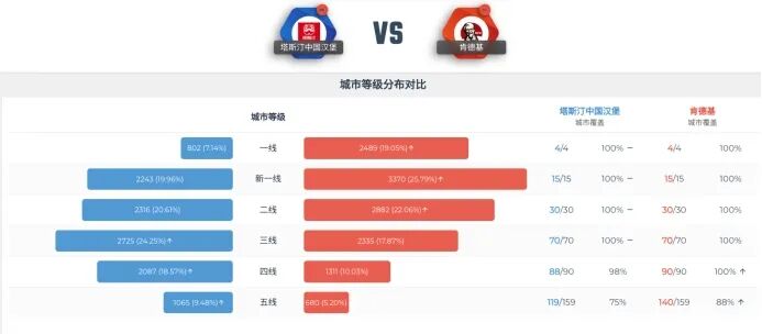 誠然,由于客單價相對更低,塔斯汀的可以像華萊士一樣,避開麥當(dāng)勞、肯德基的鋒芒,深耕低線城市。不過為了最大限度拓寬門店規(guī)模,塔斯汀并未囿于下沉市場。