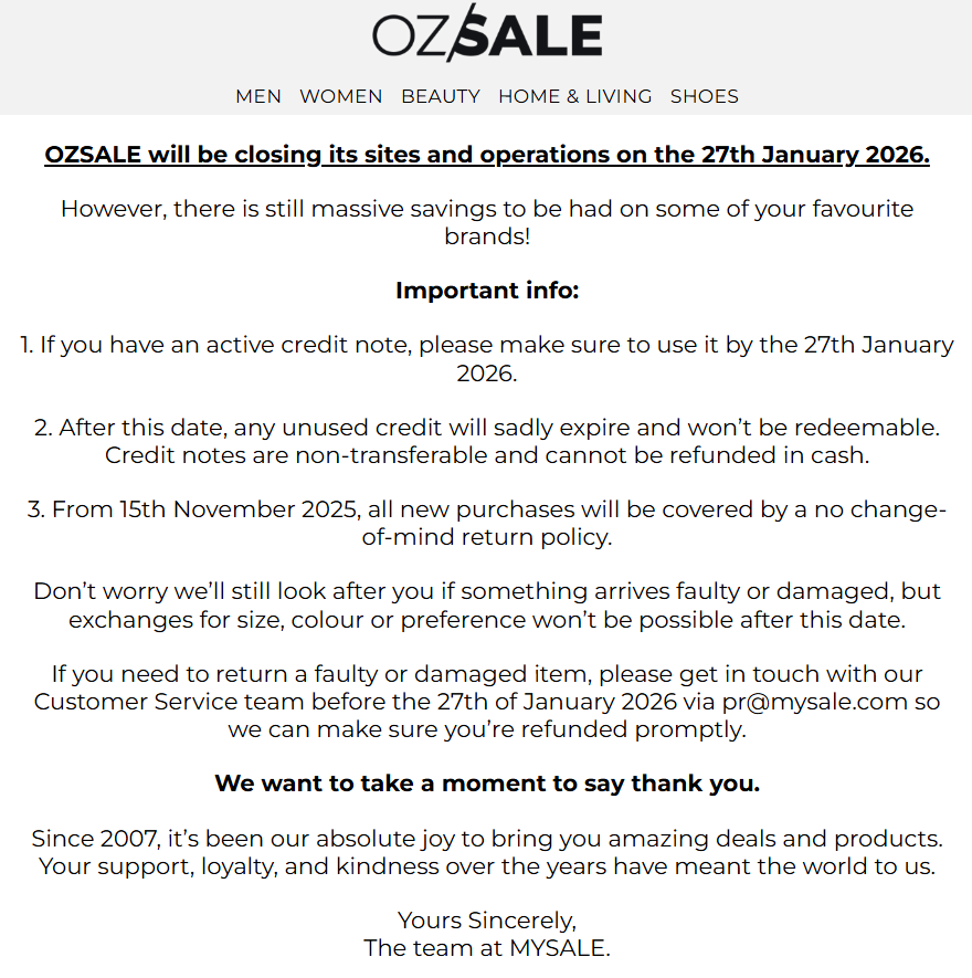 聚美麗獲悉,有著“海外版唯品會”之稱的澳大利亞知名電商平臺Ozsale于近日確認,將自2026年1月27日起關閉其網站和運營,徹底停運,屆時未使用積分失效,且值得注意的是,其自2025年11月15日起就不再接受無理由退換。