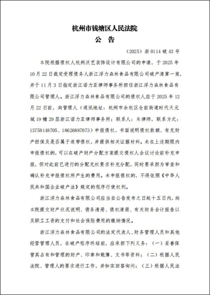 根據(jù)公告,杭州市錢塘區(qū)人民法院已于2025年10月22日裁定受理浙江浮力森林食品有限公司破產(chǎn)清算案。債權(quán)人需在12月22日前向管理人申報債權(quán)。這家曾是杭州本土烘焙標桿的品牌,最終走完了從快速崛起、資本高光到擴張受挫、信任崩塌的全過程。