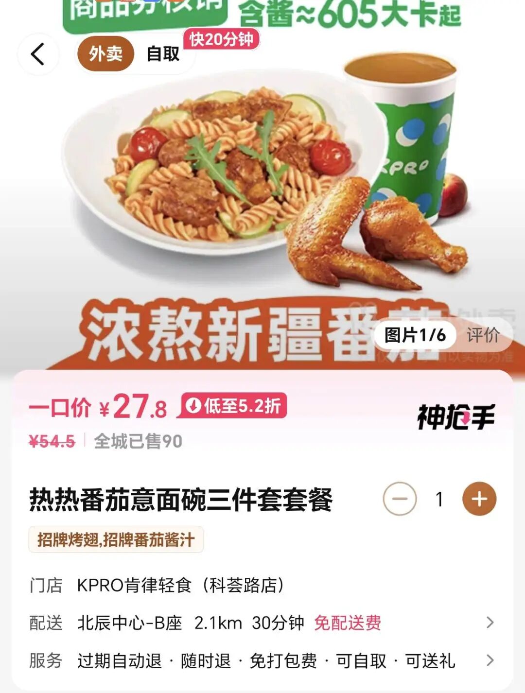 和八年前的首店相比,KPRO最大的變化是定價,從中高端輕食品牌,調(diào)轉(zhuǎn)車頭成為價格上對標(biāo)賽百味的平價輕食快餐。產(chǎn)品方面,KPRO主打四大招牌品類:燜飯能量碗、谷物能量碗、帕尼尼/多多卷和超級食物酸奶昔。大多數(shù)單品的官方定價在30元上下,少數(shù)在40元以上,其中最便宜的主食+飲品套餐售價為29.9元。疊加當(dāng)前外賣平臺的促銷活動,消費(fèi)者用27.8元就能獲得一份包含意面+烤翅+飲料的三件套。