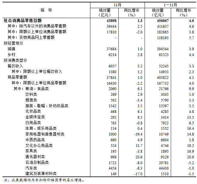 1-11月社會(huì)消費(fèi)品零售總額同比增長(zhǎng)4.0%