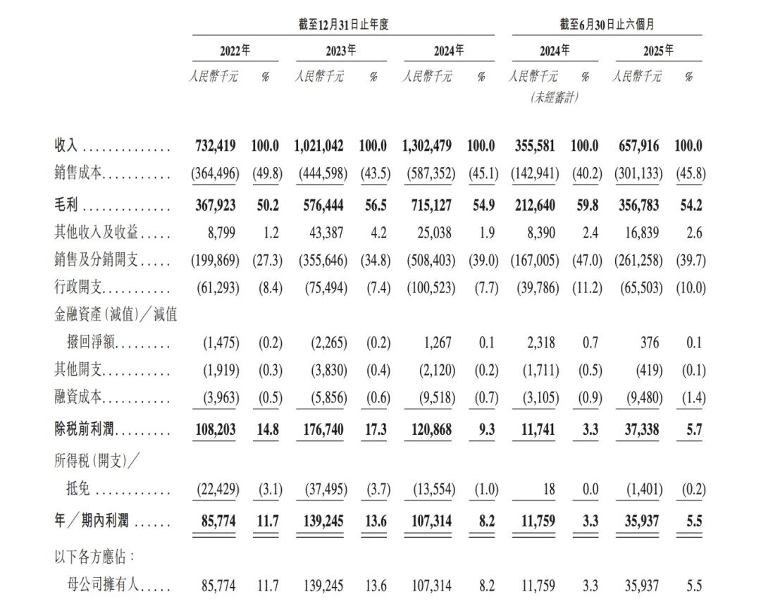 據(jù)招股書(shū),2022-2024年坦博爾營(yíng)收分別為7.32億元、10.21億元、13.02億元,三年復(fù)合增長(zhǎng)率達(dá)到33%,2025年上半年?duì)I收為6.58億元,同比大增85%。