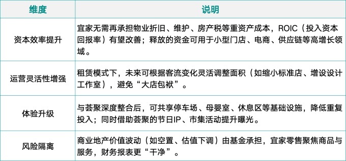 2)風(fēng)險(xiǎn)分散與協(xié)同效應(yīng):在消費(fèi)結(jié)構(gòu)性變化、電商沖擊持續(xù)的背景下,將資產(chǎn)風(fēng)險(xiǎn)部分轉(zhuǎn)移給專(zhuān)業(yè)不動(dòng)產(chǎn)基金,而自身聚焦于“體驗(yàn)營(yíng)造+品牌輸出”,是典型的“投管分離”現(xiàn)代資產(chǎn)管理邏輯。