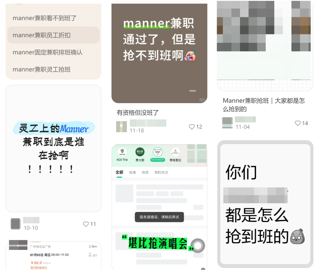 搶班失敗,已經(jīng)變成了Manner兼職新人入行的“第一課”。如果你現(xiàn)在打開社交平臺搜索Manner搶班,映入眼簾的全是“Manner的班到底是誰在搶到”的哀嚎。