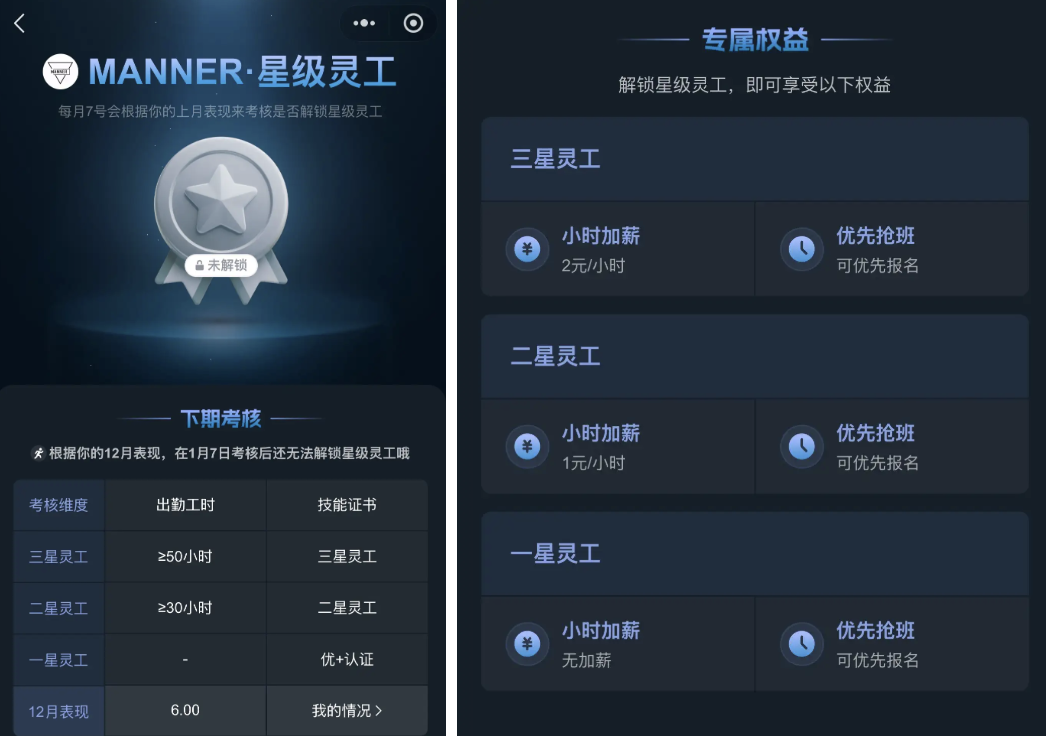這意味著,為了獲得優(yōu)先搶班權,除了穩(wěn)定的工時積累,還需要你與門店的全職伙伴和負責人“打點好關系”。換句話說,在搶班的世界混,不光要有過人的手速,還得懂點人情世故,“讓他們覺得你是幫忙而不是添亂”。