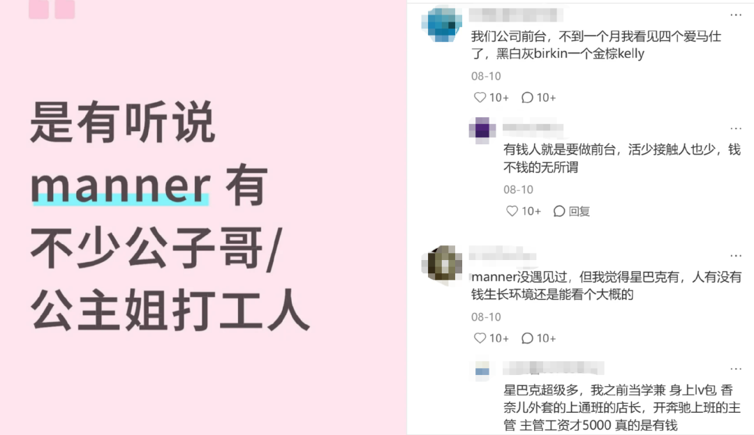第一類是“體驗派”玩家。社交平臺上有人發(fā)帖,說在Manner兼職的時候看到旁邊的兼職伙伴背著大牌包包,評論區(qū)一片共鳴。這類玩家的信條是“賺錢不重要,體驗才是王道”。畢竟,沒在服務行業(yè)沉浸式體驗過,怎么好意思說懂人間煙火?