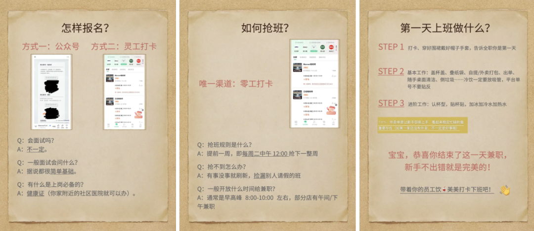 有人甚至貼心總結出了“小白搶到Manner兼職不失手”的SOP。從健康證辦理到搶班時間,事無巨細,形成了一套民間攻略,大家努力搶班的場景堪稱“搶班界人類早期馴服野生班次的珍貴錄像”。